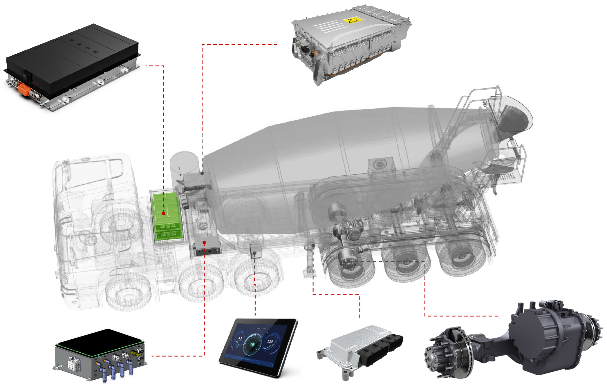 展会上,易倍体育的智电一体化解决方案引起了广泛关注。工程师团队在现场为参展观众详细介绍了混合动力牵引搅拌半挂车的系统方案。该方案基于易倍体育历经多年开发的eMagi智电平台,针对牵引搅拌半挂车进行了定向开发,涵盖以下几个方面: